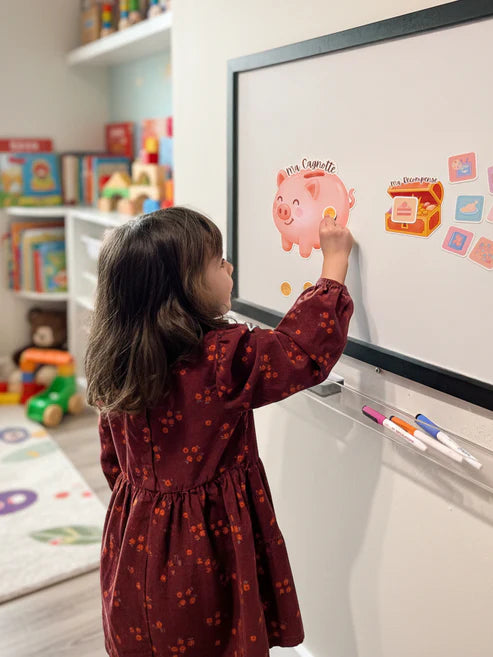 À chaque bonne action, récompensez votre enfant avec une ou plusieurs pièces d’or aimantées qu’il pourra coller sur la tirelire cochon.
