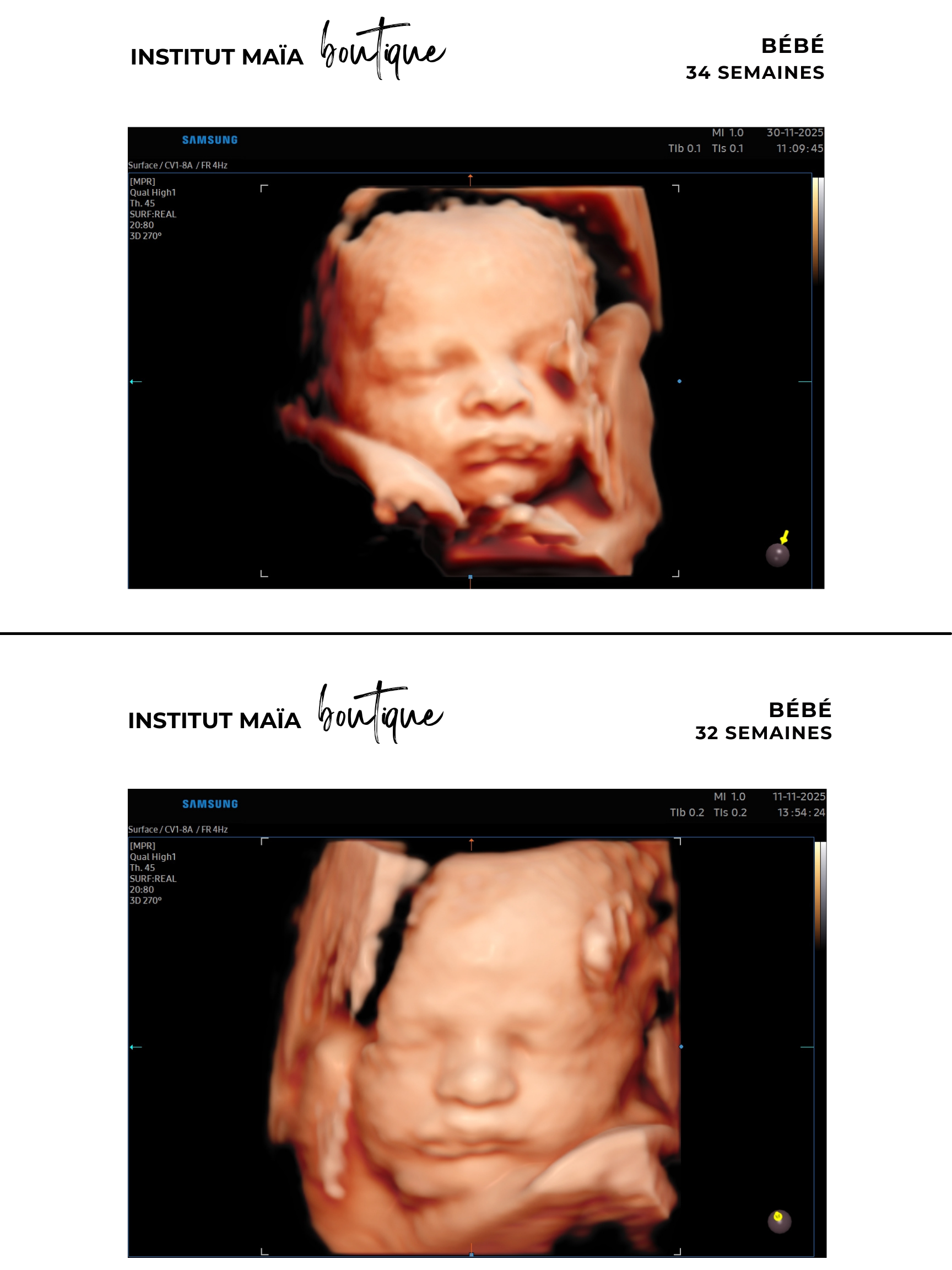 L’Institut MAÏA propose une expérience unique d’échographies non-médicales, conçue pour permettre aux futurs parents et à leur famille de créer un lien privilégié avec leur bébé avant sa naissance. Grâce à l’échographie 3D-4D, vous pouvez découvrir les traits de votre bébé et observer ses mouvements en temps réel dans le ventre de maman. Un moment inoubliable et riche en émotions