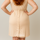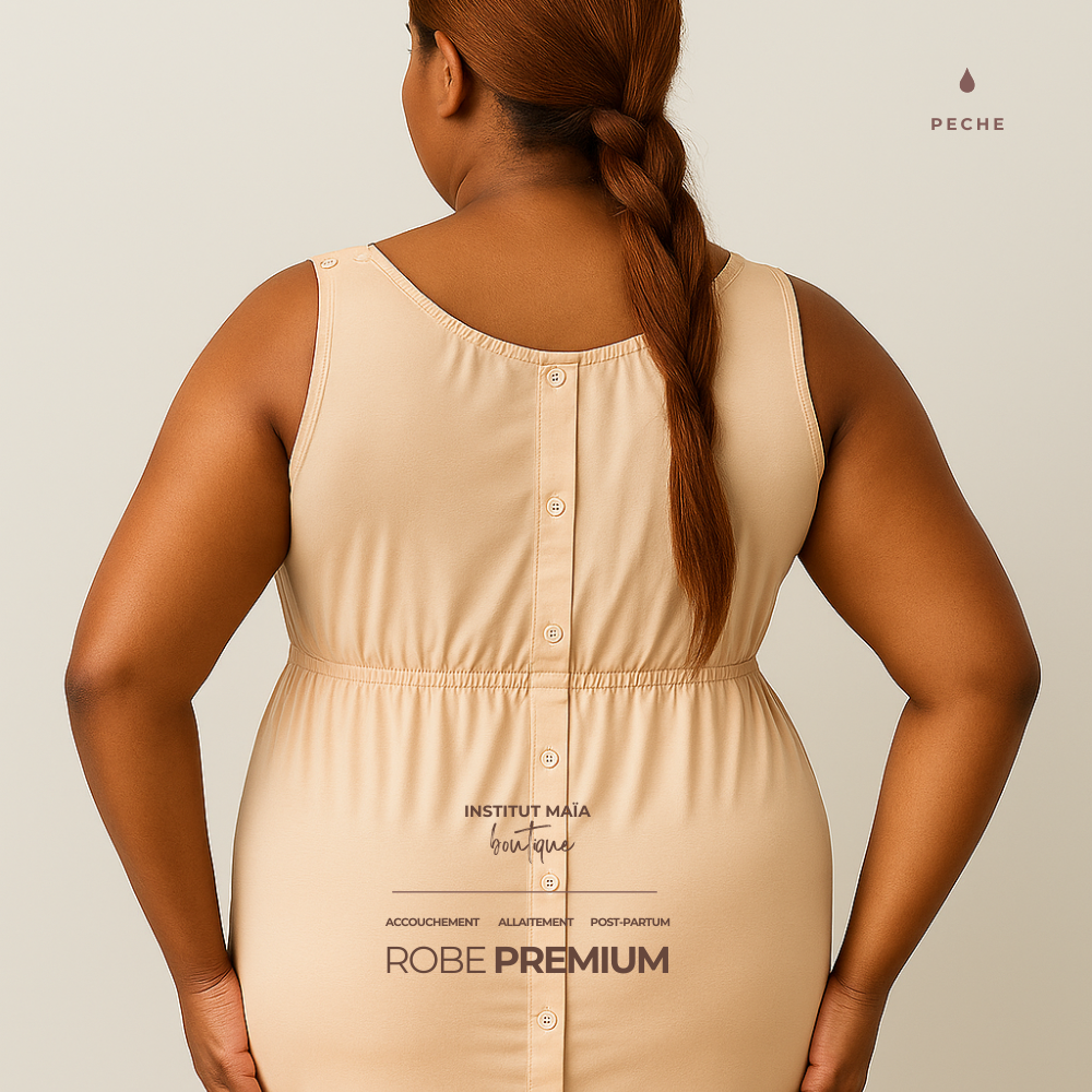 Après la naissance : Grâce aux snaps aux épaules, la robe s’ouvre en un instant pour le peau à peau avec bébé ou pour faciliter l’allaitement.